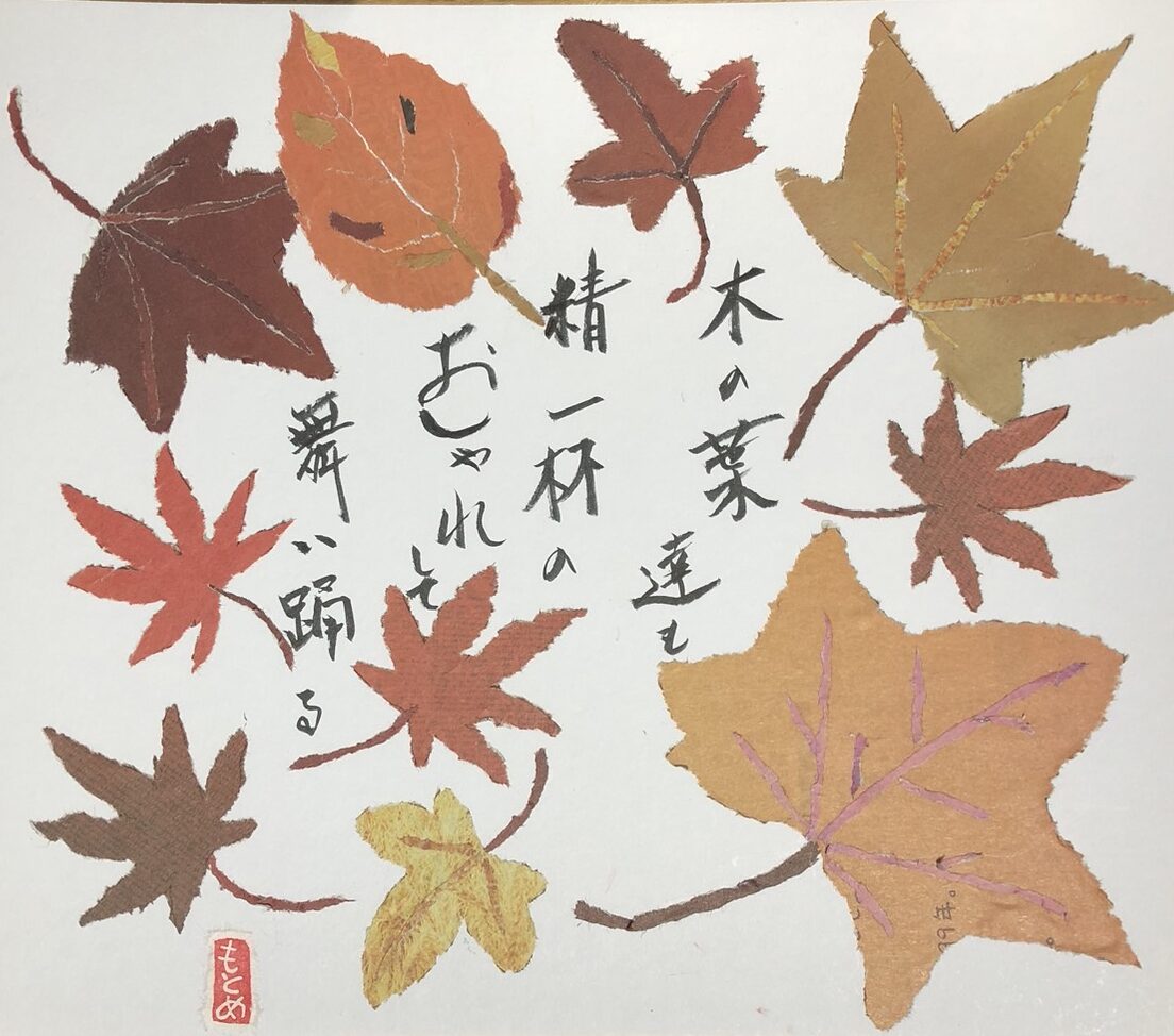 教室の敷地にあるモミジ、三角に行ったときに拾ったスズカケノキ等の落ち葉がモデル。