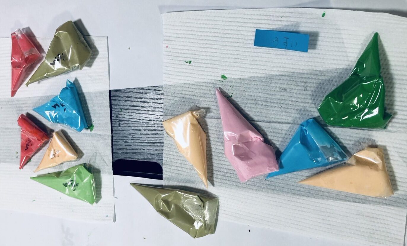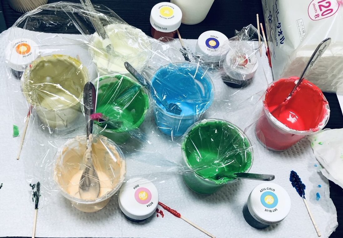 👇色を付けて、フチ用と流す用で水で固さを調整し、絞り袋に入れます